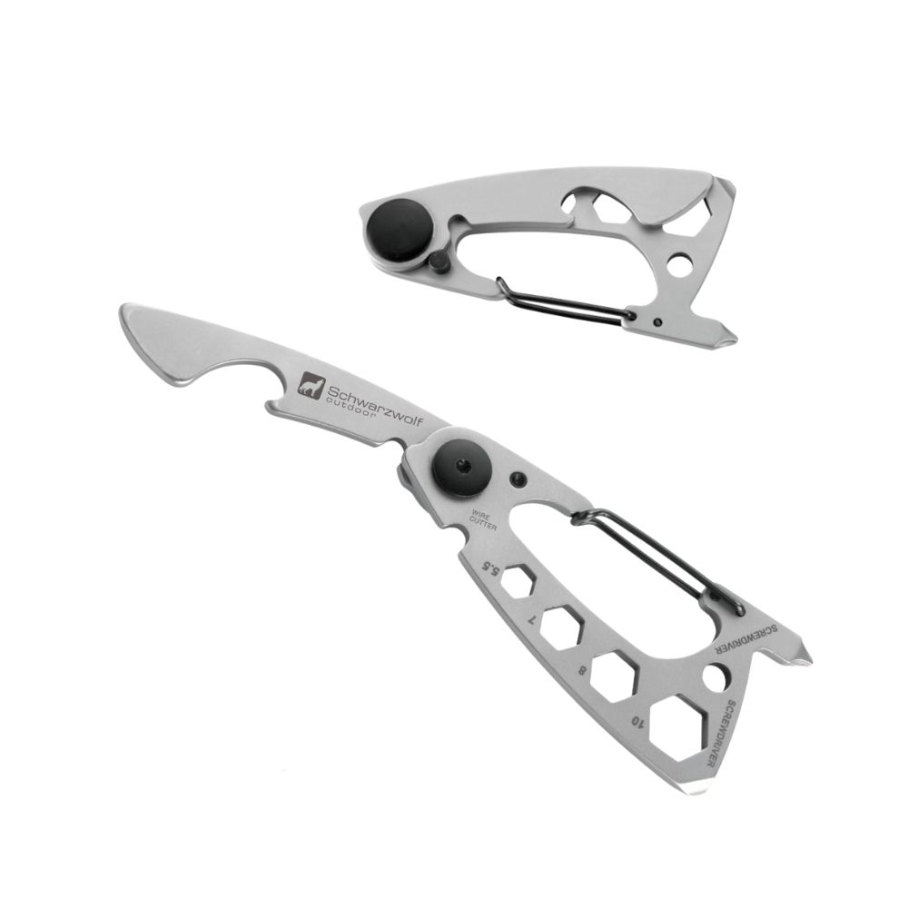 Multifunkční nářadí značky Schwarzwolf s 10 funkcemi. Obsahuje karabinu, otvírák na láhve, multifunkční otvírák, zdrhovací kleště, šroubovák, křížový šroubovák a klíč na matice (4 velikosti). Baleno v dárkové krabičce Schwarzwolf. Materiál: nerezová ocel 420. Rozměry: 7,5 × 3,5 × 0,7 cm. Uhlíková stopa: gCO2 e495.